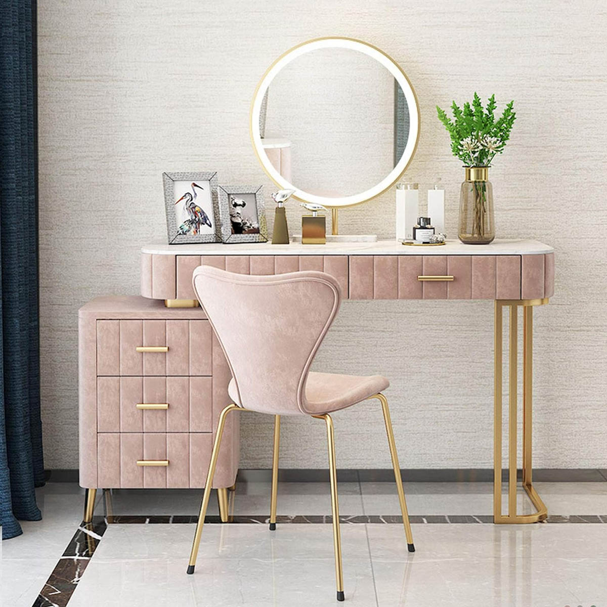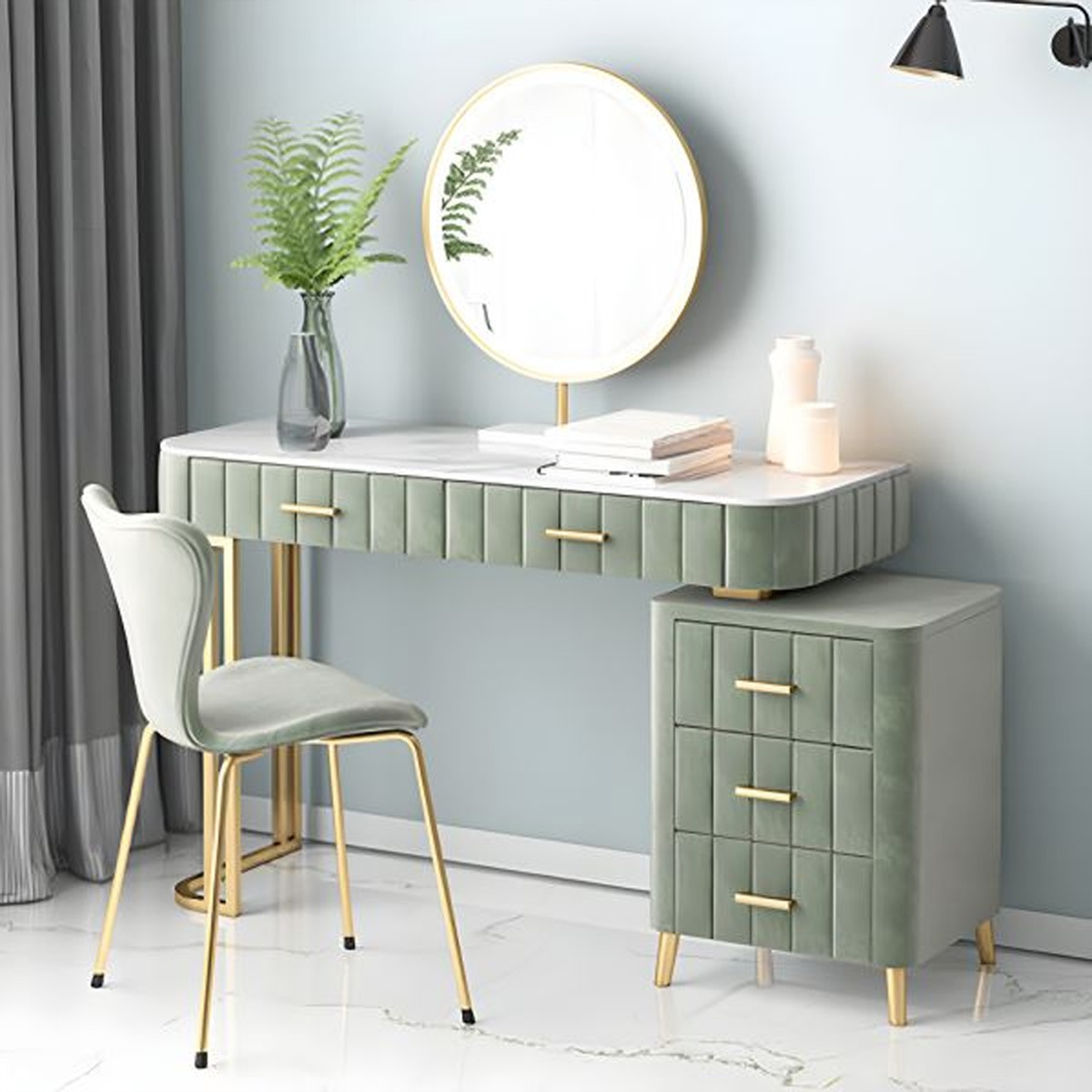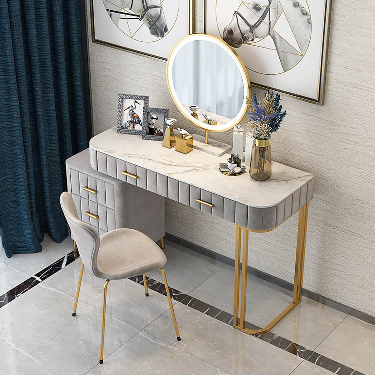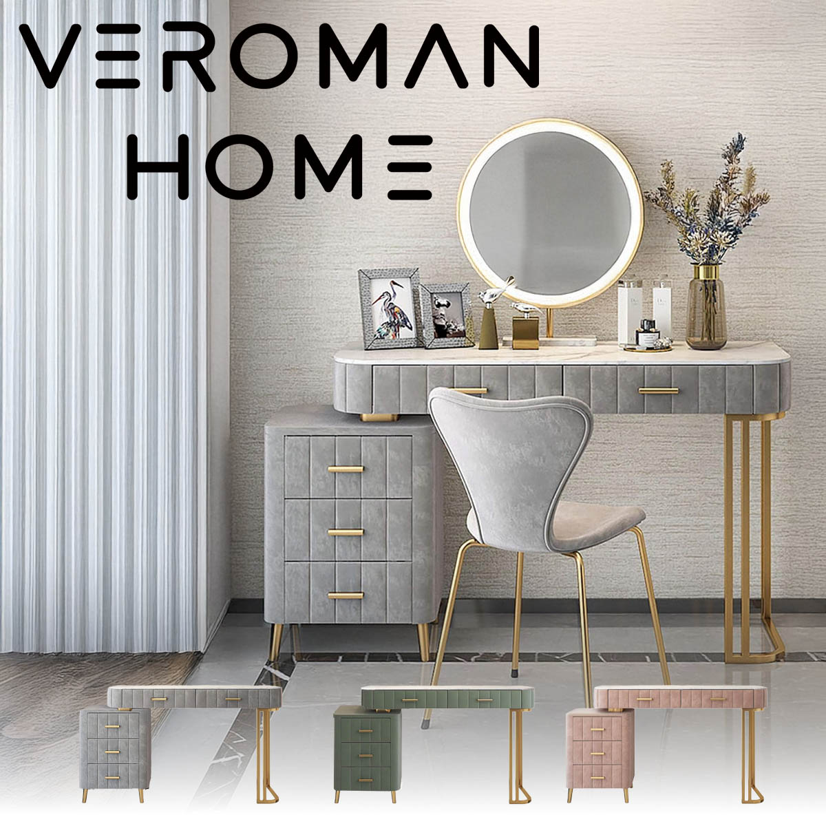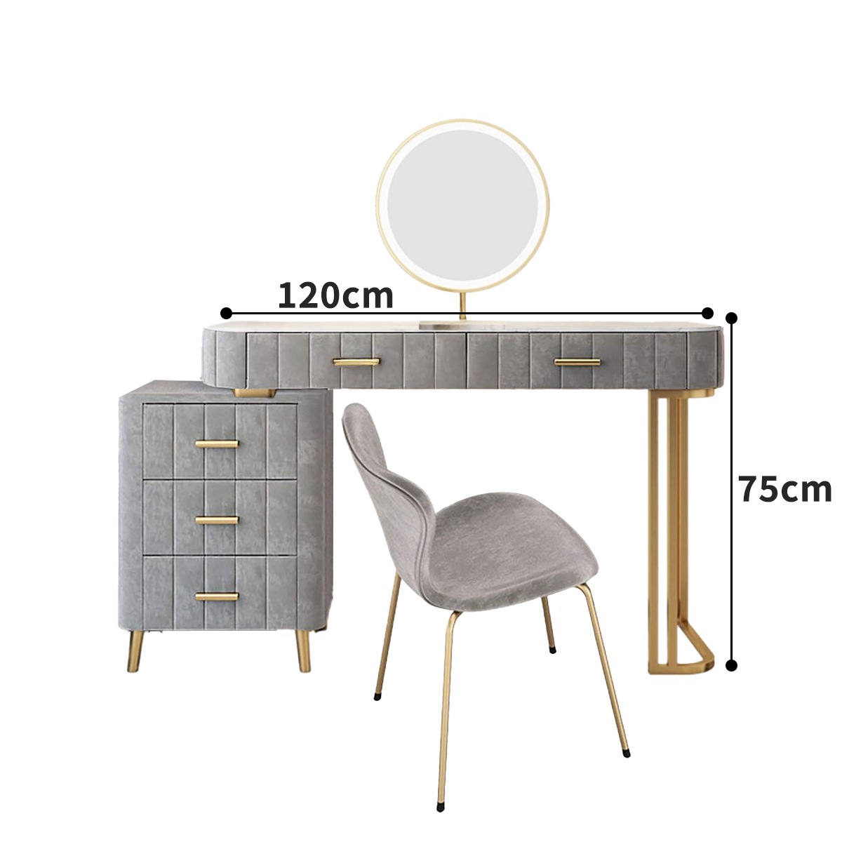 ・整塊大理石のテーブルトップが特徴で、シンプルで洗練されたデザインが魅力的 ・高精細LEDライト付きの化粧鏡を搭載しており、明るく均一な照明で、メイクやスキンケアの際にクリアで快適な視界を提供 ・引き出しと収納スペースが豊富にあり、化粧品やアクセサリー、小物をすっきり整理整頓できます ・丸みを帯びた角のデザインが特徴で、安全性と美しさを兼ね備え、リラックスした空間を作り出します |
