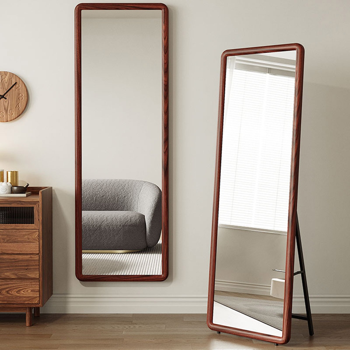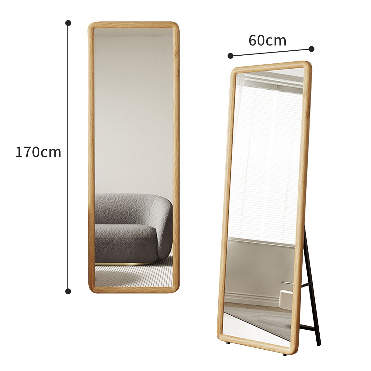このミラーが選ばれる理由 ・木製フレームの温もりが空間に自然に溶け込みます。 ・全身がしっかり映るサイズ感で、毎日の身支度に最適。 ・防爆加工ガラスを採用し、万が一の破損時も安心。 ・三角力学+H型構造で、安定感のある設計。 ・壁掛け・立て掛けの2WAY仕様で、設置場所を選びません。 |